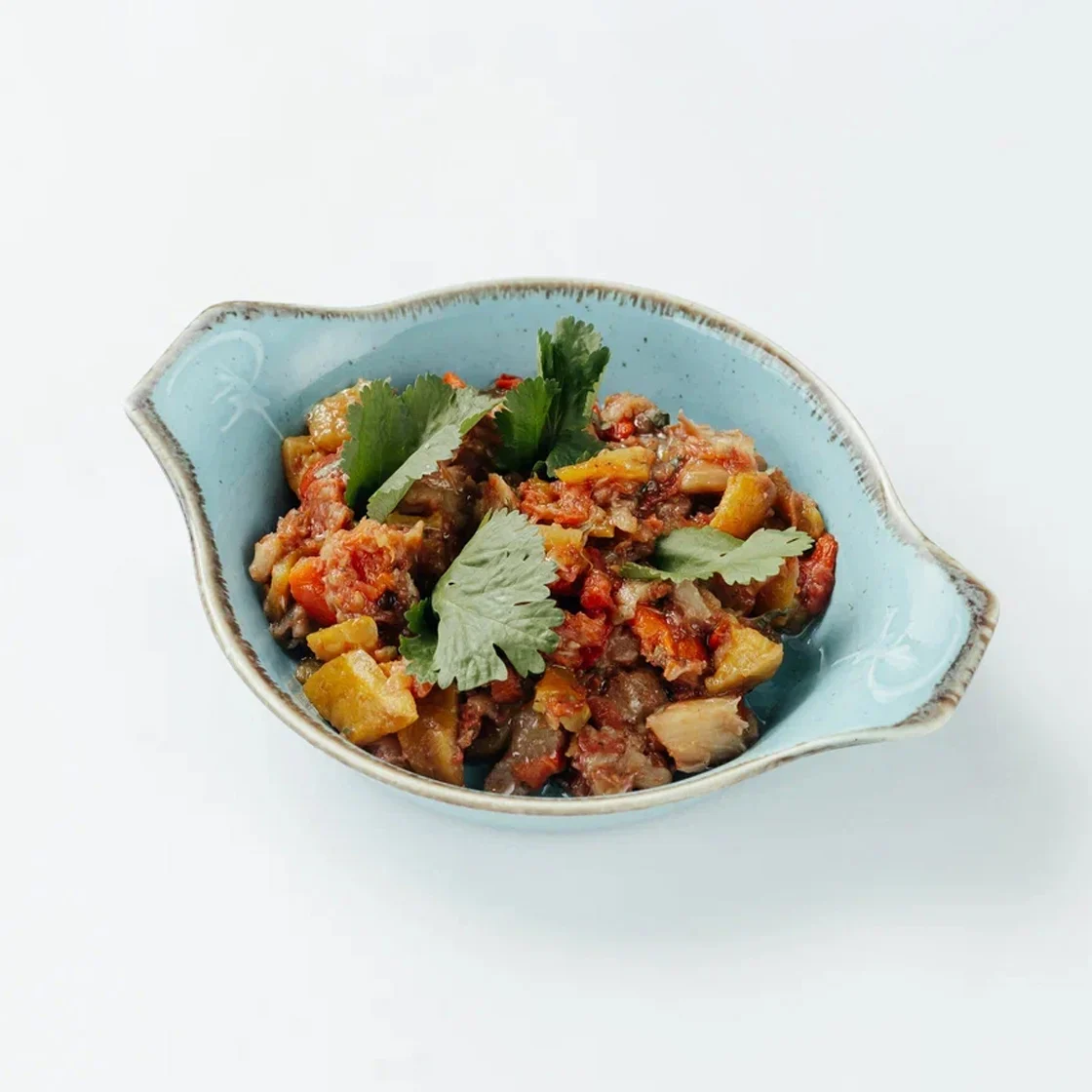 Салат из резаных овощей на мангале: болгарского перца, томатов, баклажанов, красного лука. С добавлением кинзы, чеснока, перца чили и хлопьев чили, заправленный растительным маслом. Это холодное блюдо, вопреки сложившемуся стереотипу.