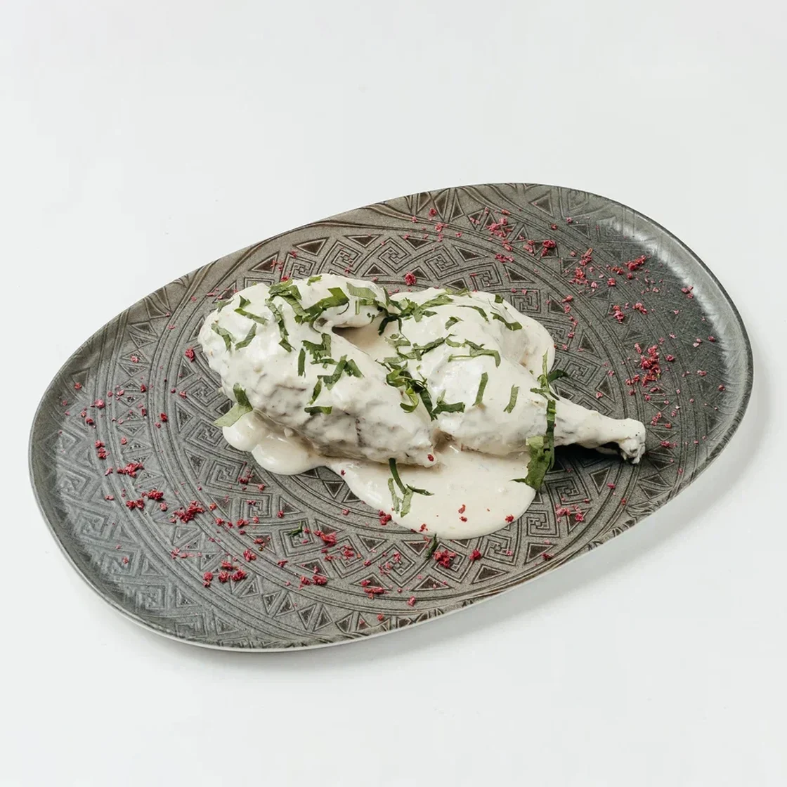 Цыпленок корнишон (половинка)маринованный в грузинской аджике, шафране, утсхо сунели и кинзе, и хлопьев чили. Перед подачей поливается соусом на основе сливок,хлопьев чили и чеснока.