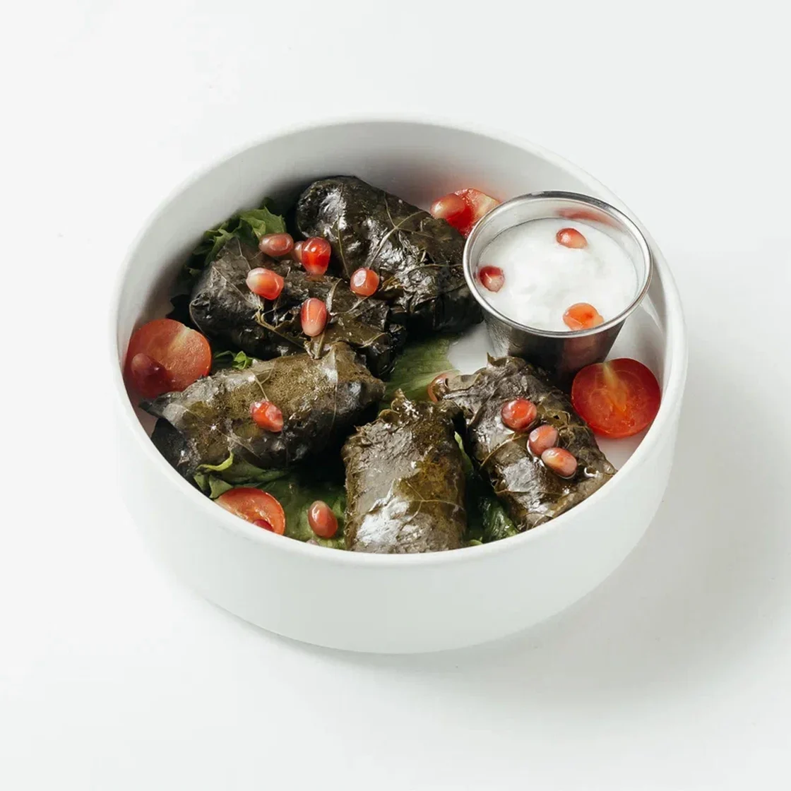 говяжий фарш, завернутый в виноградные листья. Подается с мацони с чесноком в соуснике, выкладывается на лист салата украшается томатами черри и зернами граната.