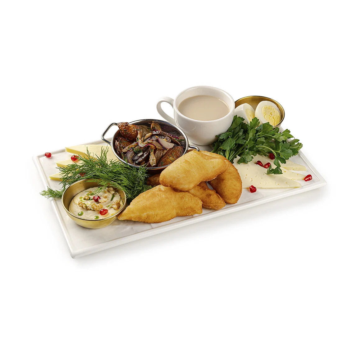 Отварное яйцо, чай калмыцкий, жареный картофель с вешками и горской колбасой (говядина), хумус классический, сыр брынза и сулугуни, зелень.
