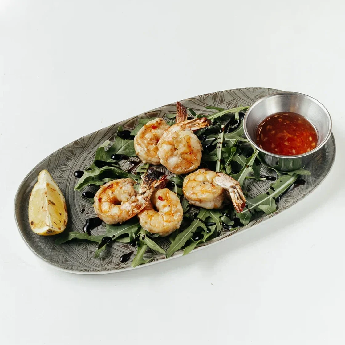Тигровые креветки в маринаде из белого вина, соевого соуса чеснока и хлопьев чили. Обжариваются на шпажке с кабачком, томатом черри. Подаются на подушке из руколы с лимоном сладким чили.