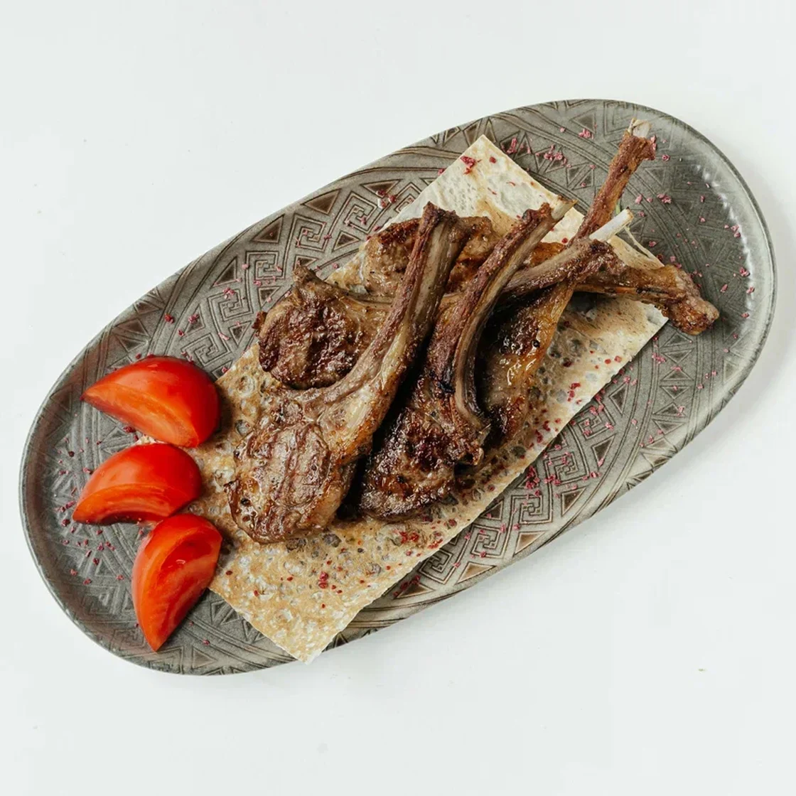 Мякоть ягненка на кости , в классическом маринаде (соль,перец,сумах,зира,сухая кинза) подается на лаваше с дольками свежих томатов.