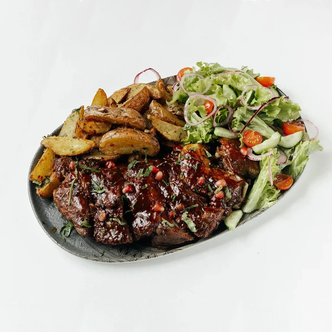 Томленная баранья лопатка приготовленная по технологии сювит, маринованная в устричном соусе, масле,кетчупе,сахаре,смеси из пяти перцев. Подается с подгарнировкой из свежего салата и хрустящего запеченного картофеля по-грузински. Украшается кнзой и гранатом