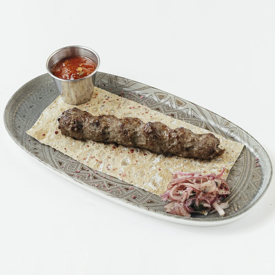 Кебаб ягненка подается на лаваше, с маринованным луком, сумахом и соусом сацебели.