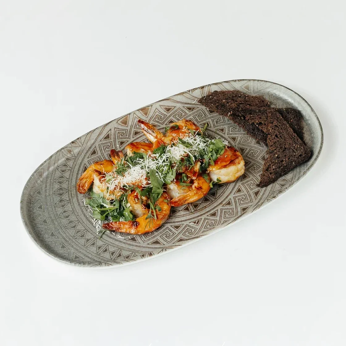 Тигровые креветки обжариваются в соусе из белого вина, соевого соуса чеснока и соуса шрирача с добавлением мякоти спелого томата. Подаются на подушке из обжаренного томата, украшаются тестом катаифи.