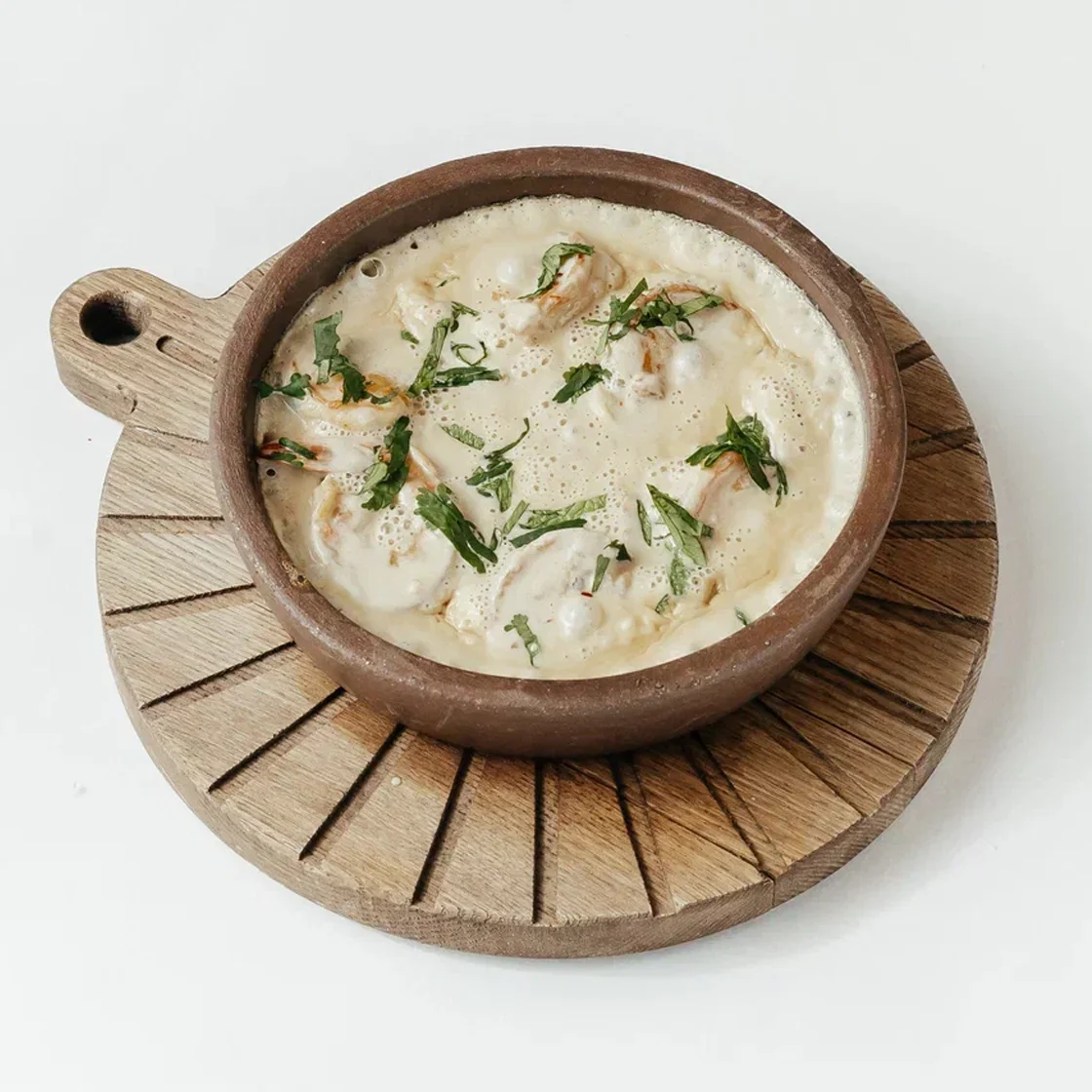 Тигровая креветка обжаривается в соевом соусе, с чесноком и хлопьями чили и свежей кинзой. По готовности заливается сливками с соевым соусом, как сливки начинают затягиваться , добавляется тертый копченый сулугуни. Соус доводится до готовности, выкладывается в разогретый кетци.