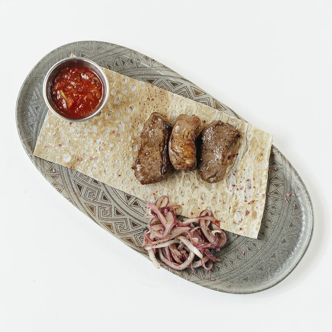 Мякоть ягненка, в классическом маринаде (соль,перец,сумах) подается на лаваше с соусом сацебели и маринованным луком.