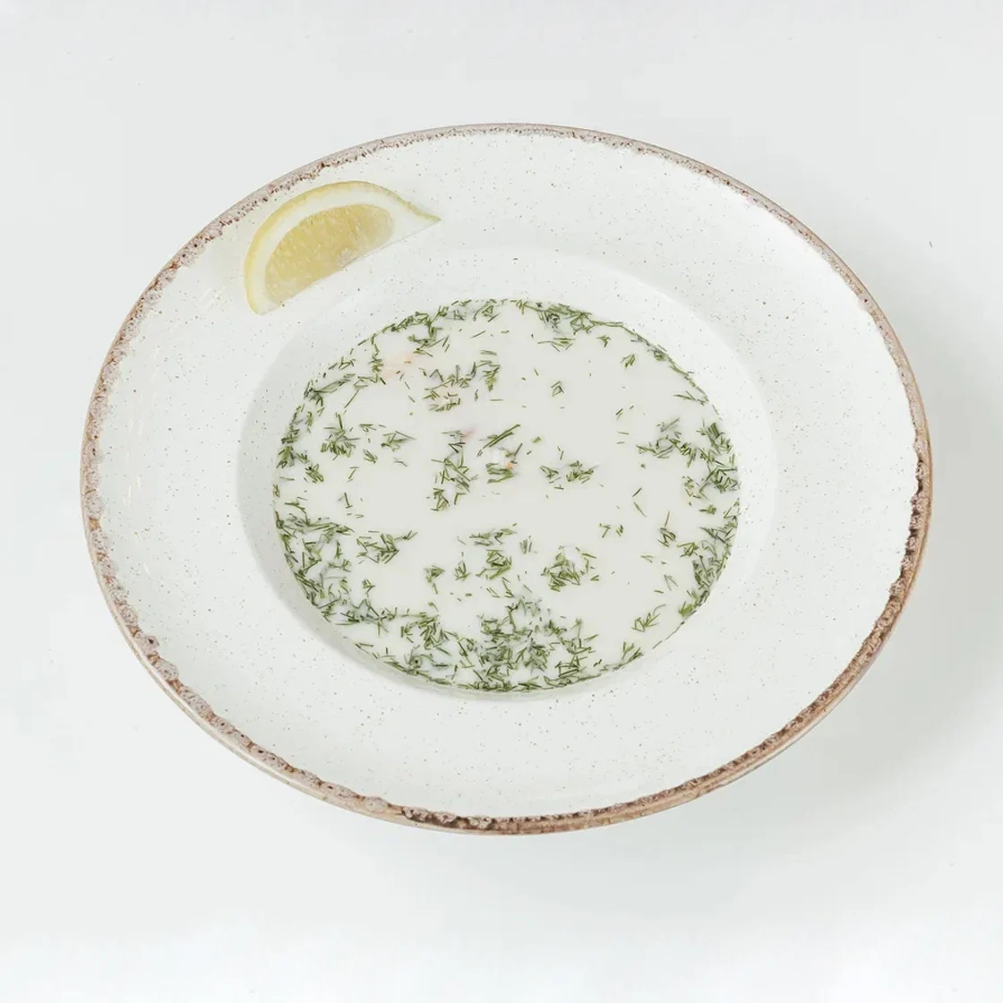 Нежный суп на основе рыбного бульона с добавлением сливок филе форели и креветки, свежими овощами и грузинскими специями. Подается с долькой лимона и зеленью .