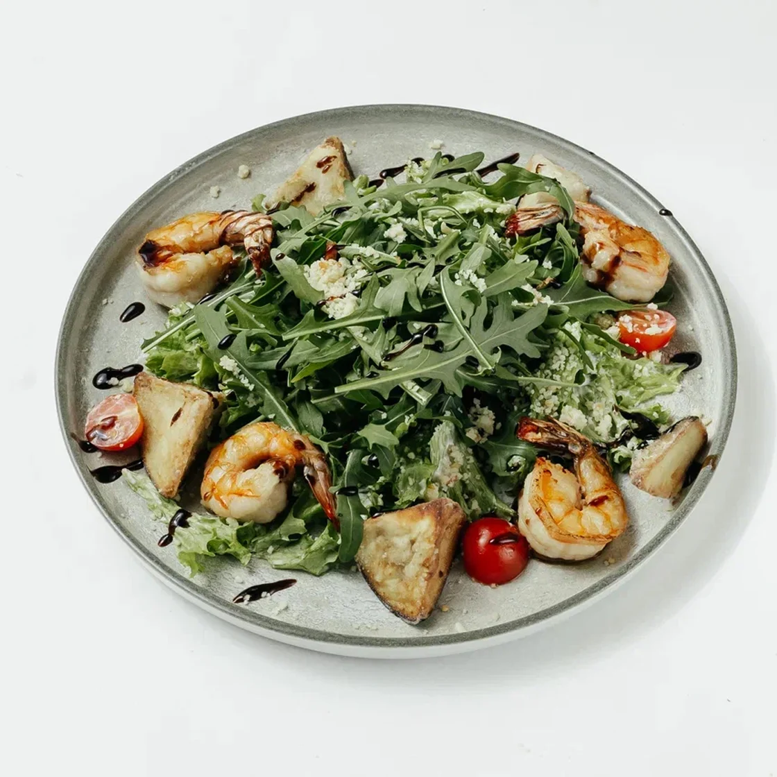 Салат с креветками и хрустящими жареным баклажанами, с добавлением микса салата, томатов черри , тертого копченого сулугуни, руколой. Креветки обжариваются в соевом соусе,с добавлением чеснока и перца чили. Заправляется салата, соусом от шефа и крем-бальзамиком .