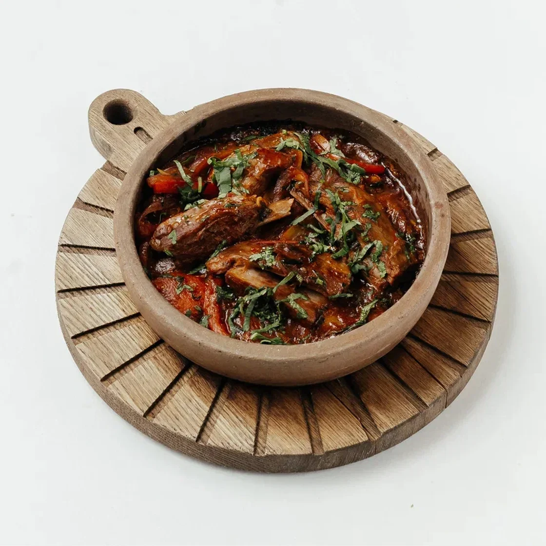 Бараньи ребра и мякоть тушится в томатной пасте и аджике, с чесноком, томатами, красным луком, хлопьями чили грузинскими специями и сухой кинзой. Подается в разогретом кетци с сливочным маслом и свежей кинзой.