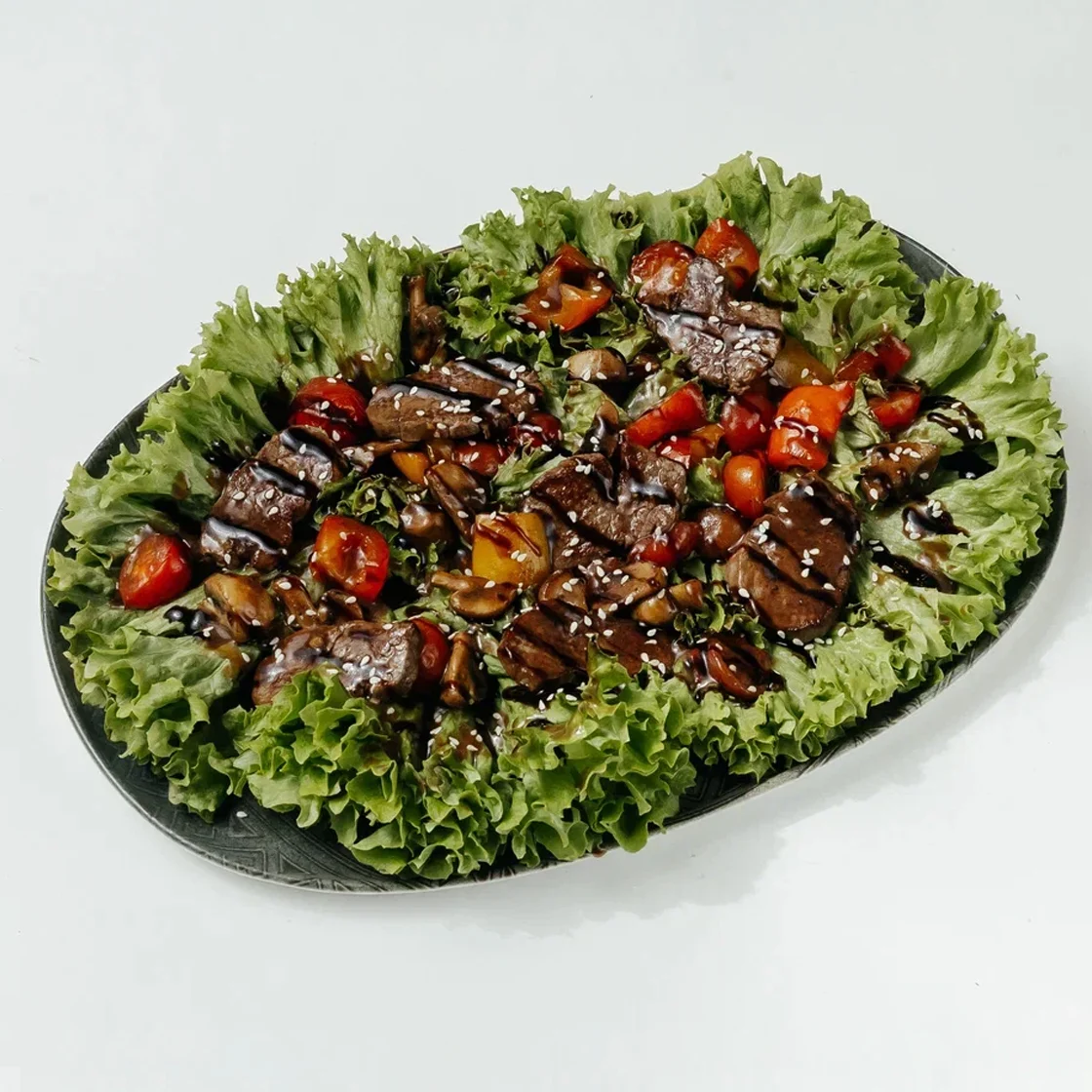 Говяжья вырезка обжаривается до степени медиум с томатами черри, шампиньонами и болгарским перцем на растительном масле, обваливается в горячем соусе деми глас. Овощи выкладываются на микс салата взбрызнутый лимонным соком. Поверх овощей выкладываются слайсы говяжьей вырезки , поливается крем бальзамиком и украшается кунжутом.