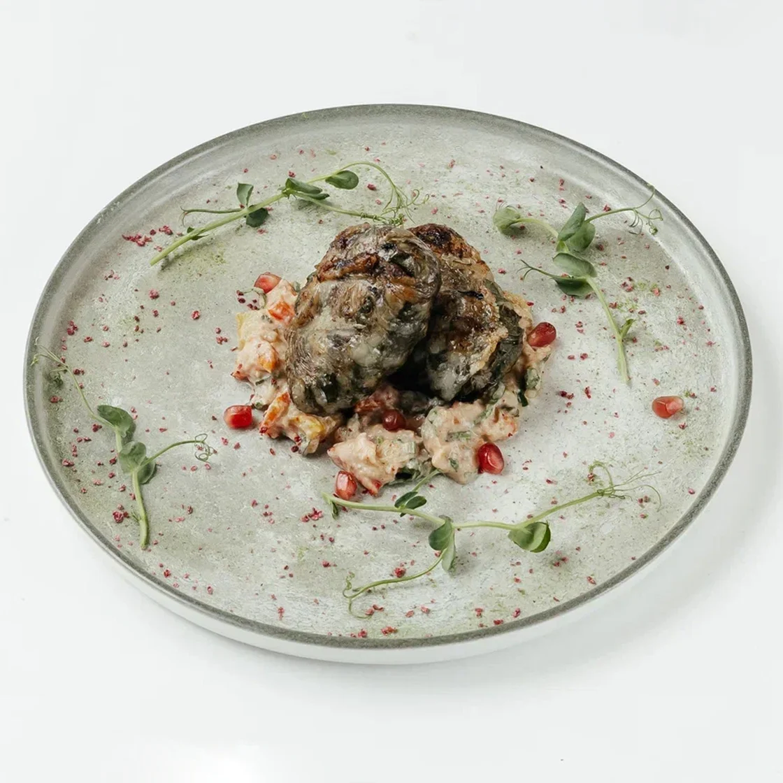 Толма готовится из мякоти молодого ягненка перемолотого в фарш, с добавлением душистых грузинских специй, заворачивается в виноградный лист и жировую баранью сетку. Запекается на мангале до золотистой корочки, подается с овощами.