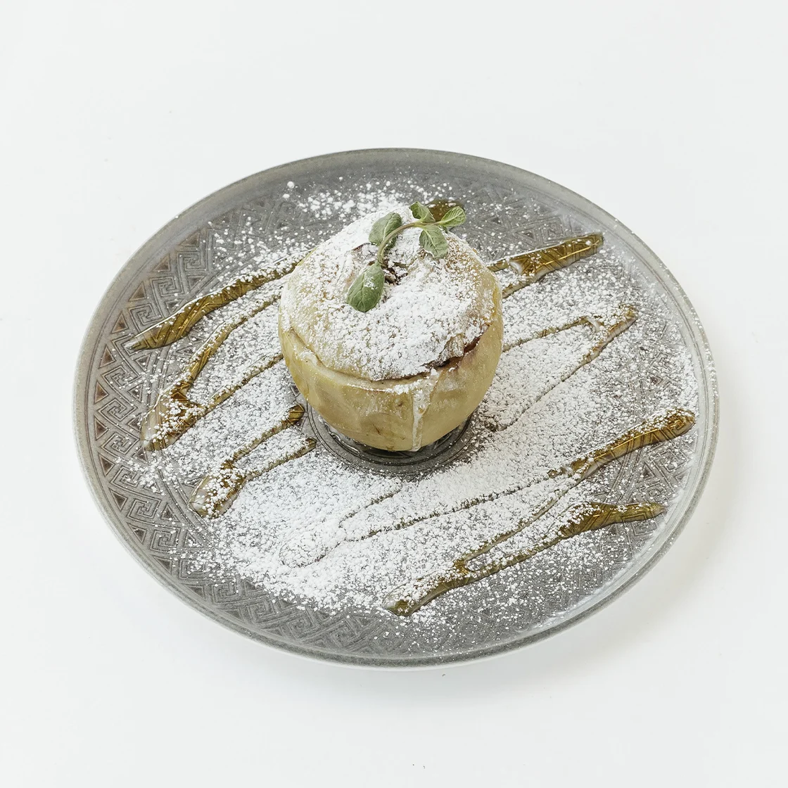 Яблоко начиненное грецким орехом, изюмом, мед, корицей и ванилью. Украшается медом, сахарной пудрой и мятой.