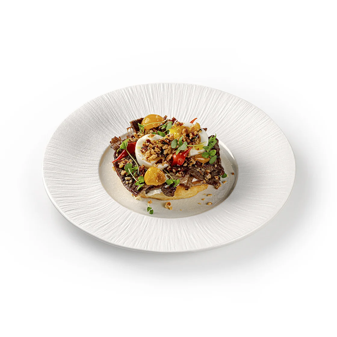 Обжаренная пышка смазывается соусом из крем-фреш, пармезана и чеснока. Наполняется говяжьим беконом, яйцом пашот, соусом песто с вялеными томатами. Украшается маринованными томатами черри, перцем бикиньо и жареным луком.